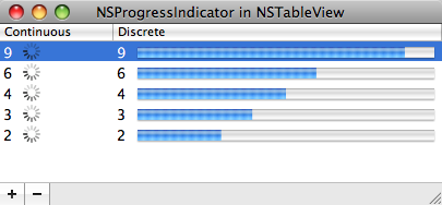 In Cocoa, NSProgressIndicator is easily placed into an NSView using Interface Builder, but embedding the object in a list (NSTableView or NSOutlineView) takes a bit of coding. CocoaDev discusses it, but I thought I'd throw together a simple project demonstrating it, pictured above. It's available on Google Code and as a zipped file (Xcode 3.1).