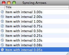 Let's make syncing arrows for a sample Mac application. Originally, I thought I should use Core Animation, as it's in 10.5+. However, at WWDC, an Apple Core Animation engineer told me that only the iPhone apps can rotate table cells like that, as only UITableViewCells subclass a view object (UIView). On the Mac, NSCell subclasses NSObject directly, so he said to go with a simple NSTimer and cycle through a set of images. So, that's what I did here.