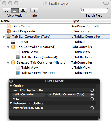 }Next, the XIB. We change the "File's Owner" object to the main controller class and connect the new tabBarController outlet to the UITabBarController in the XIB. When the XIB is loaded, the tab bar controller is added to the main controller.