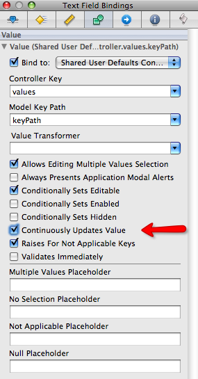 Today, I was looking at a UI bug where the value of an NSTextField, populated through Cocoa Bindings, wasn’t getting saved. I tabbed over to the field, changed the value, tabbed over to the blue “Done” button and hit Space. Value saved. No bug. So I tried following the steps to reproduce exactly. Click in the field; change the value; click “Done”. Ah, the value didn’t save. Turns out, bindings don’t fire by default for an NSTextField unless it loses focus. To get the bindings to fire, I had to go into Interface Builder and check “Continuously Updates Value” (see the screenshot). With that checked, the bindings fired for both NSControlTextDidEndEditingNotification and NSControlTextDidChangeNotification notifications.