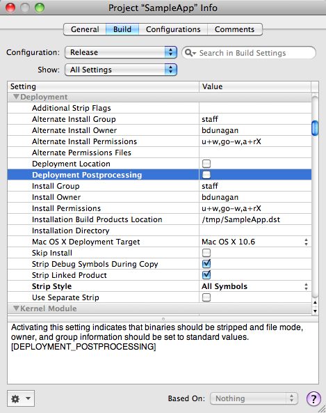 As I mentioned earlier, Apple’s default Release configuration does not strip out symbols. In fact, it leaves them all in, regardless of what “Strip Style” (STRIP_STYLE) is set to. The culprit is “Deployment Postprocessing” (DEPLOYMENT_POSTPROCESSING). When not enabled, Xcode ignores the setting for “Strip Style”. Apple describes this “Deployment Postprocessing” option in Xcode Build System Guide: Build Configuration and further in Xcode Project Management Guide: Building Products.